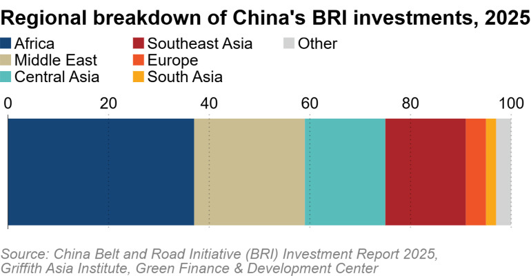 按地区划分,2025年非洲在“一带一路”倡议中获得了最多的投资