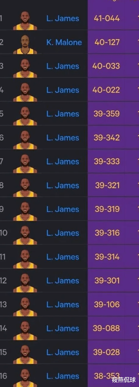 这个记录恐怕后无来者。虽然本赛季无缘全明星首发,但詹姆斯继续用自己的方式延续着生涯的亮点表现,令人致敬。