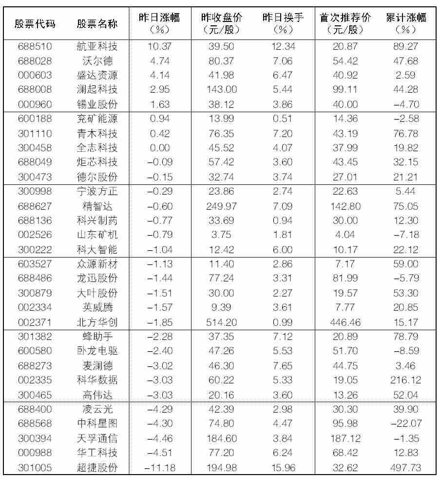 大众30指数成份股中,20日涨幅前五位的分别是航亚科技、沃尔德、盛达资源、澜起科技、锡业股份,涨幅分别为10.37%、4.74%、4.14%、2.95%、1.63%;跌幅榜上,超捷股份、华工科技、天孚通信、中科星图等跌幅居前。